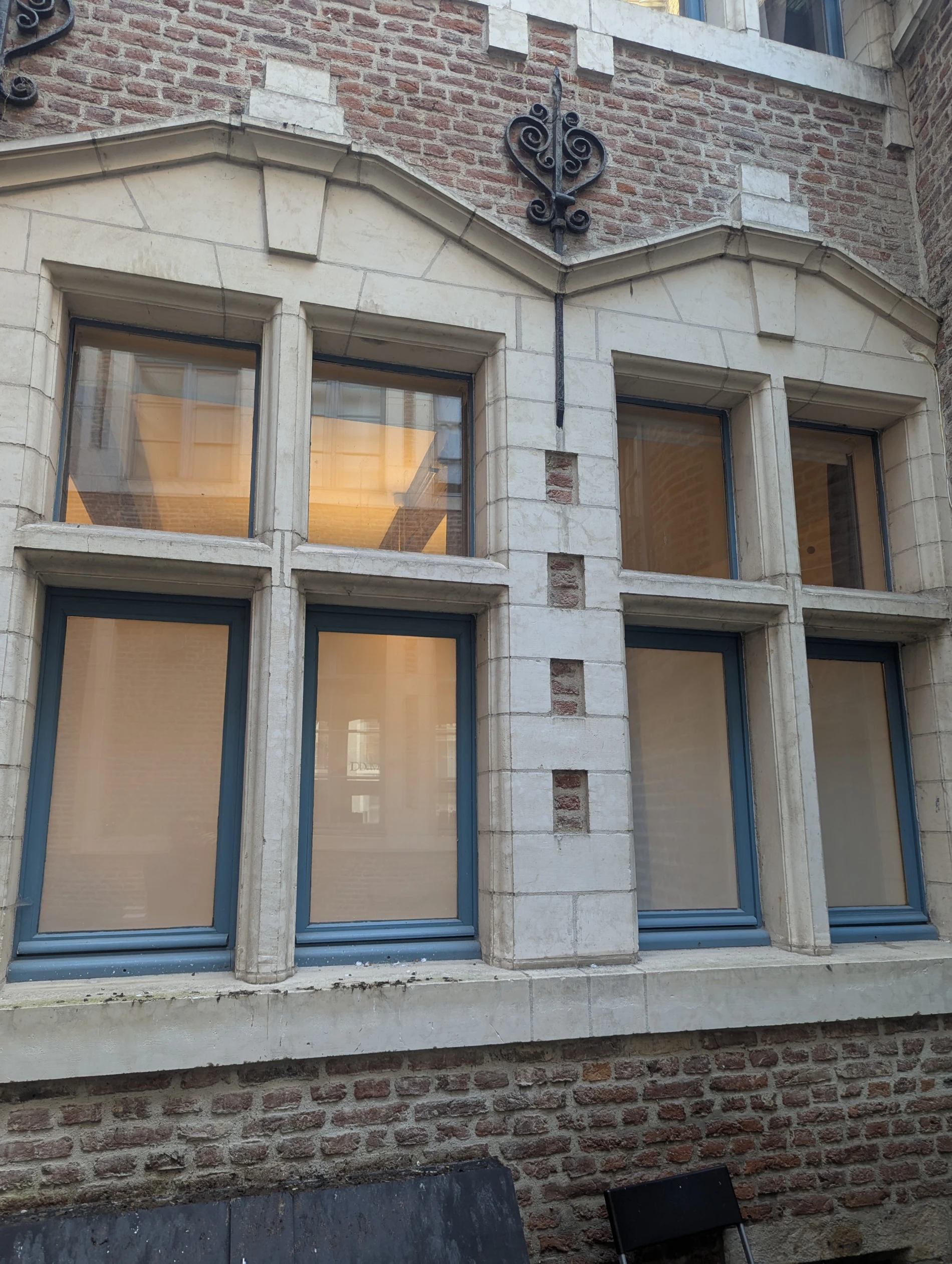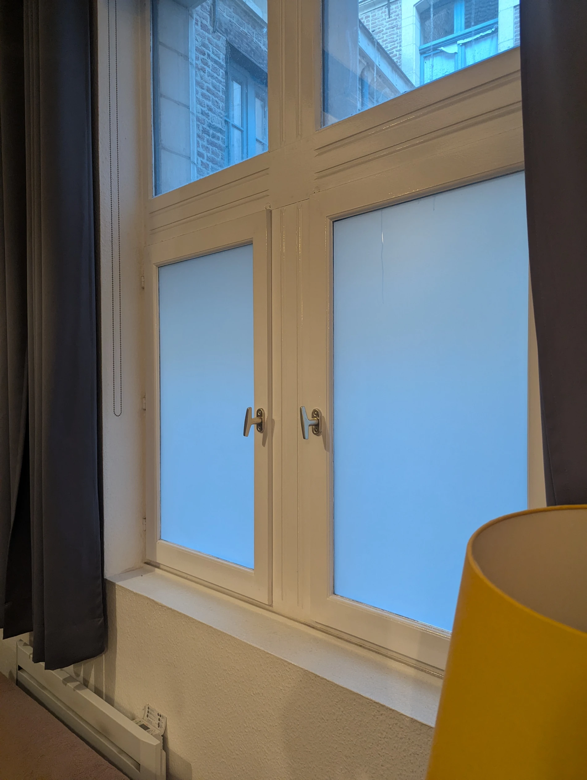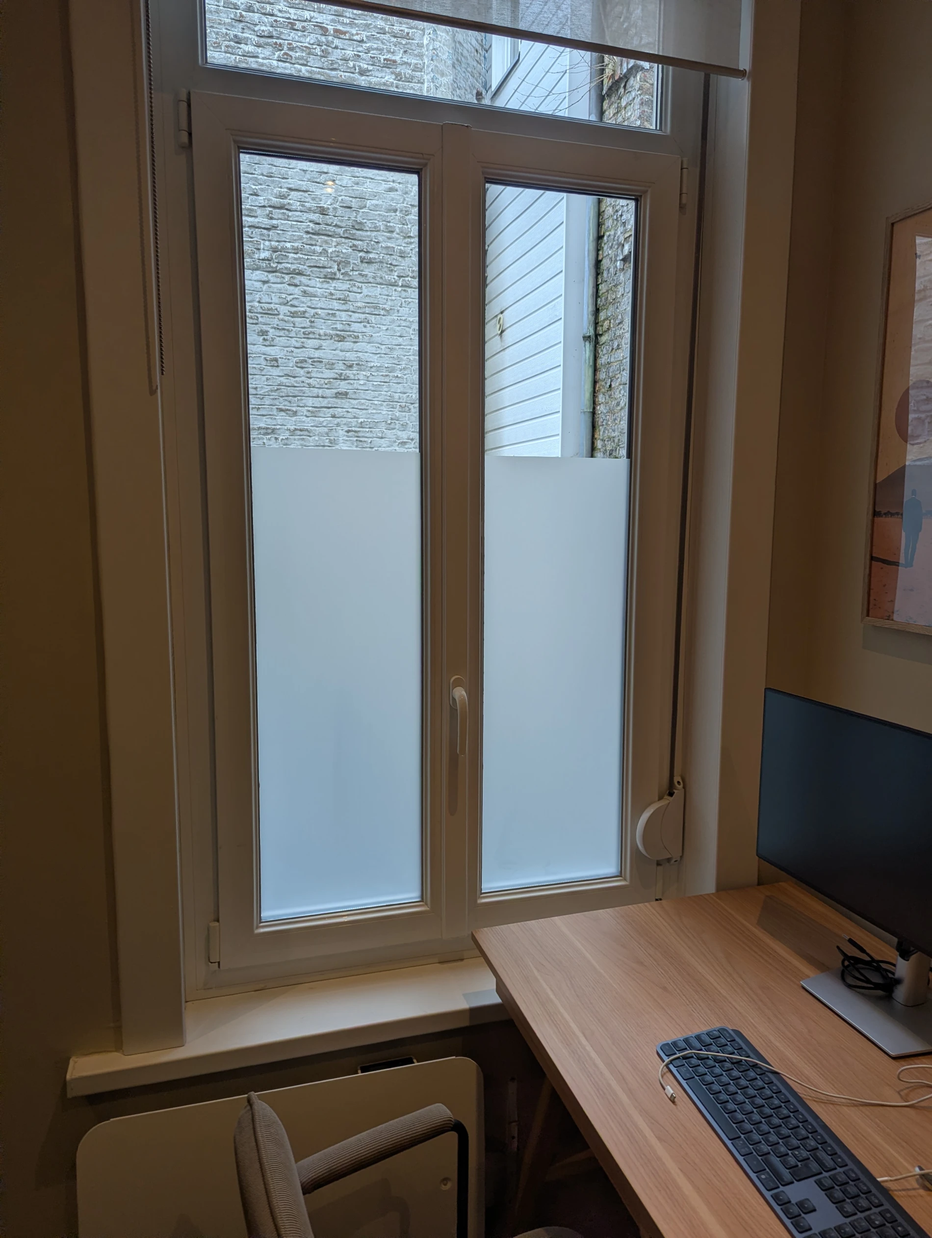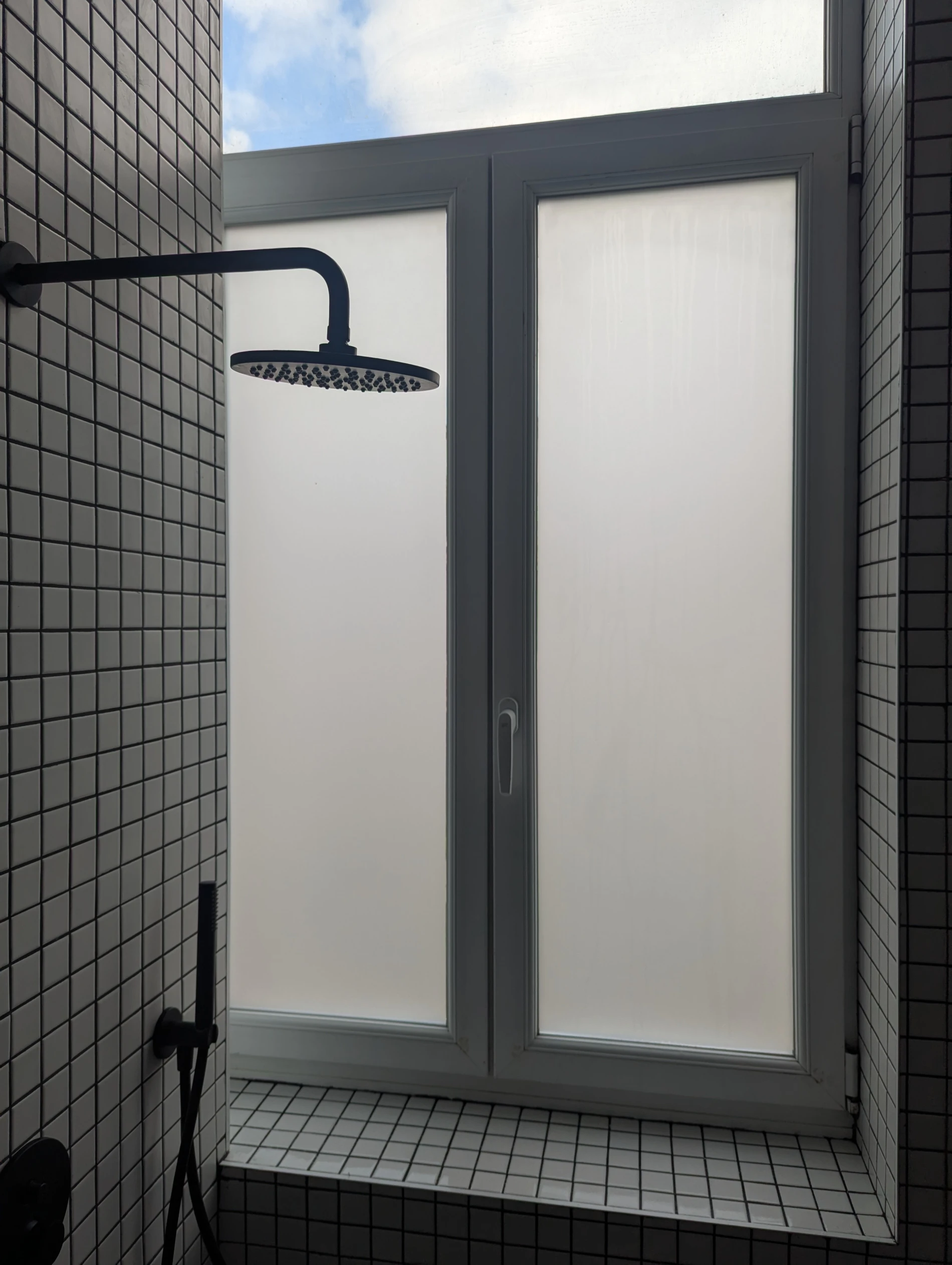 La pose elle-même a été réalisée selon une technique professionnelle de pose humide. Une solution d’application a été pulvérisée sur la vitre et sur la face adhésive du film pour fenêtre, permettant d’ajuster précisément le positionnement avant la fixation définitive. Les techniciens ont ensuite utilisé une raclette professionnelle pour maroufler le film, chasser l’eau résiduelle et assurer une parfaite adhésion sur toute la surface. Les découpes finales ont été réalisées avec une grande précision afin d’épouser parfaitement les contours du vitrage et des cadres.
