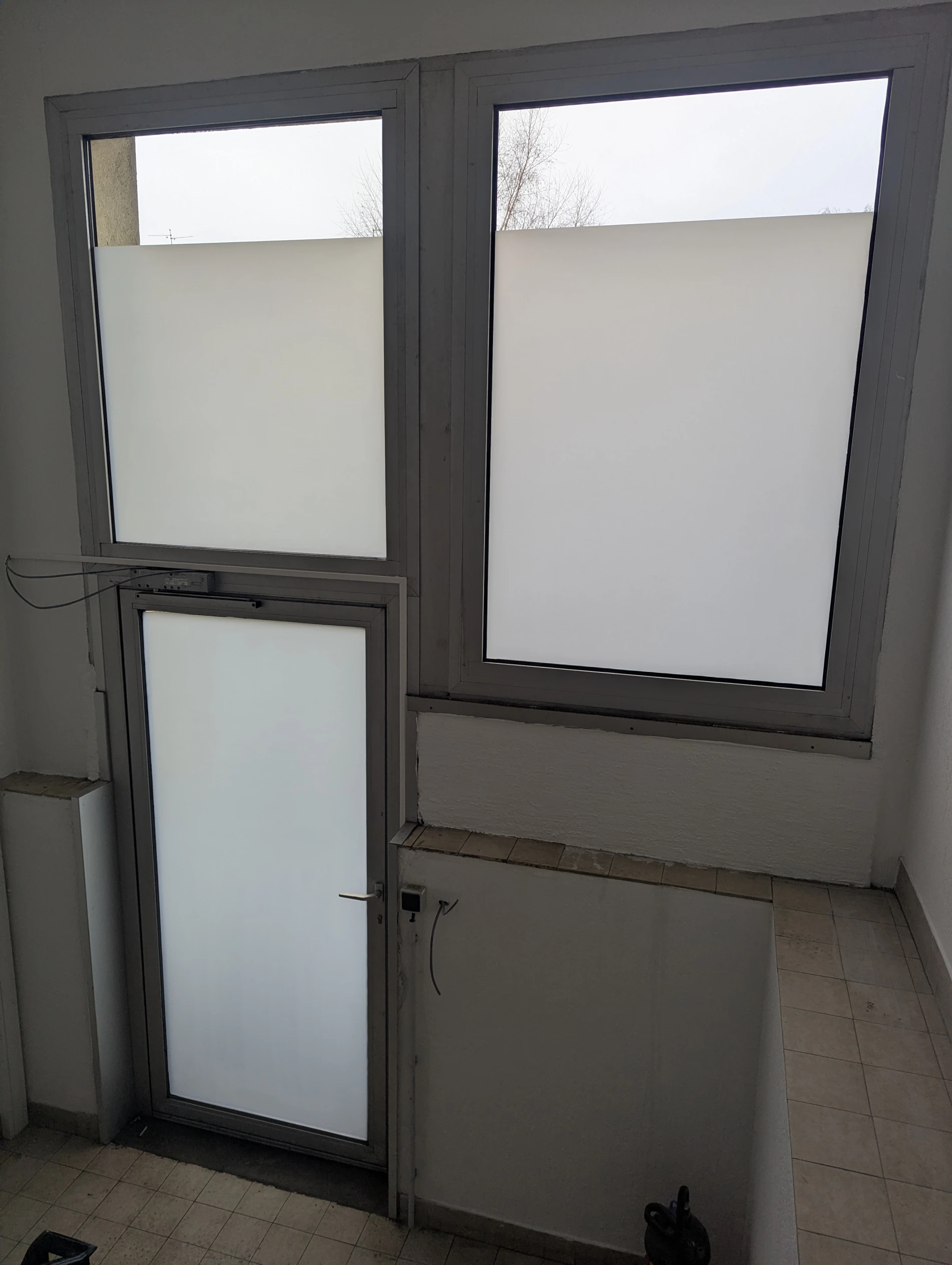 Le matériau utilisé sur ce chantier est un film polyester multicouche de haute qualité, doté d’un adhésif acrylique sensible à la pression. Ce type de revêtement technique offre une excellente durabilité ainsi qu’une résistance aux rayons UV et aux variations de température. Selon les zones à traiter, les techniciens ont installé soit un film dépoli permettant de conserver la luminosité tout en floutant la visibilité, soit un film occultant conçu pour bloquer totalement la vue à travers la surface vitrée.